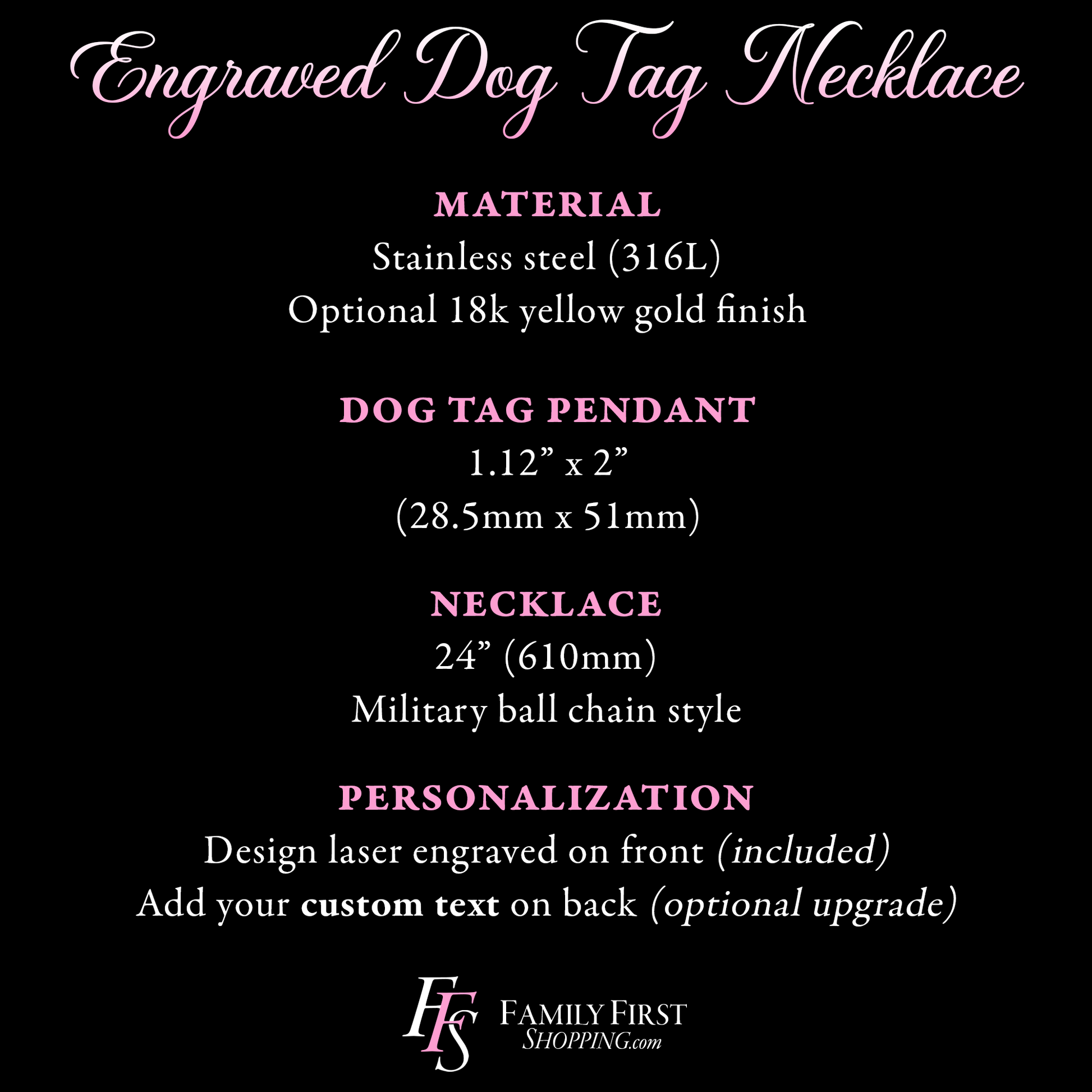 • Dog tag size: 1.1” x 2” (28.5 x 51mm)